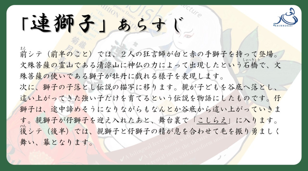 3)舞台上で「連獅子」親獅子・仔獅子の生化粧 (解説付き)
