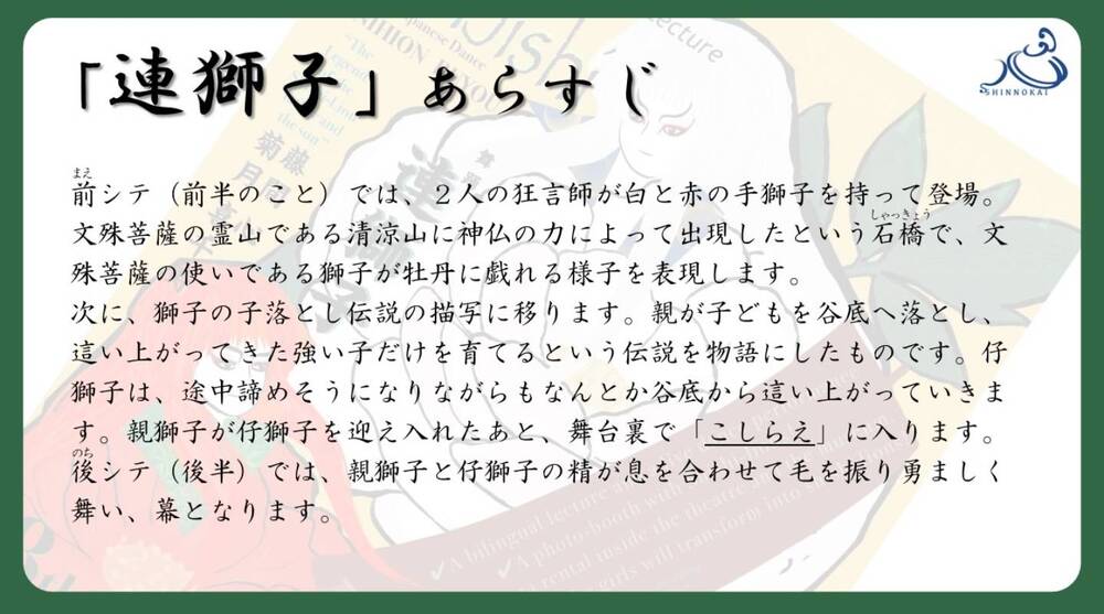3)舞台上で「連獅子」親獅子・仔獅子の生化粧 (解説付き)