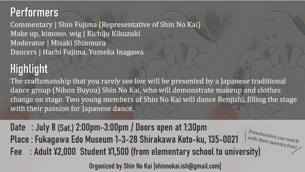 あの白塗りのお化粧がどのように施されるのか?あの重厚な衣装がどうやって着付けられるのか?滅多に見ることのできない職人の技を、ぜひ生で御覧ください。初めての方にも楽しんでいただけるよう、解説付きでお送りします。
