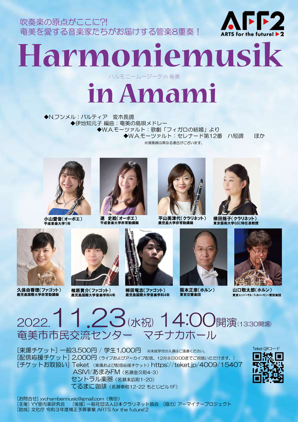 モーツァルトのハルモニームジークの傑作ハ短調のセレナードのほか、伊地知元子編曲の奄美の島唄メドレーや、各楽器の紹介も交えて、皆様にお楽しみいただけるプログラムでお届けします!