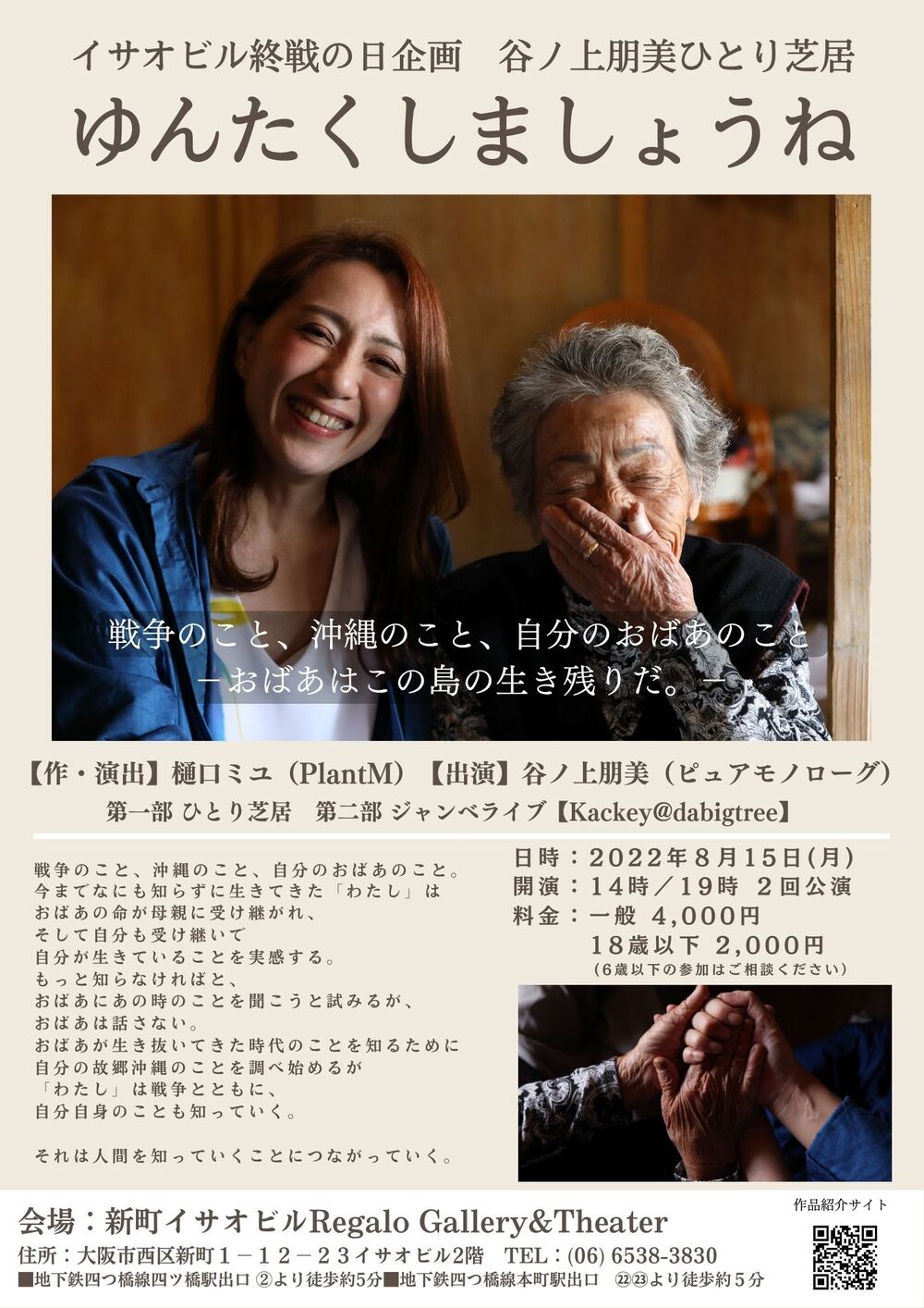 谷ノ上朋美の祖母は、沖縄戦で親兄弟姉妹を全員失った。戦後の厳しい時代を生き抜いてきた祖母の思い、命を繋いだ先人たちの想いを祖母からの聞き取りや沖縄戦の跡地をめぐるガイドツアーなどの経験をベースとして、「平和といのちの大切さ」を、今までにない新しい視点で描いた渾身のひとり芝居。沖縄返還50周年である2022年5月にイサオビル「1972年展」共催で大阪プレビュー公演、6月に沖縄本公演を開催し多くの観客の共感を得た。沖縄県でテレビや新聞など多くのメディアに取り上げられ、Yahoo!ニュースにも掲載された。