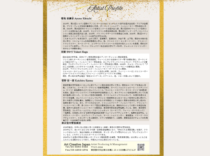 ミヒャエル・ロイシュナー、カール・バート各氏に師事。2013年、ウィーン・ベーゼンドルファーザール(モーツァルトハウス内)にてウィーン・ソロデビューリサイタル開催。