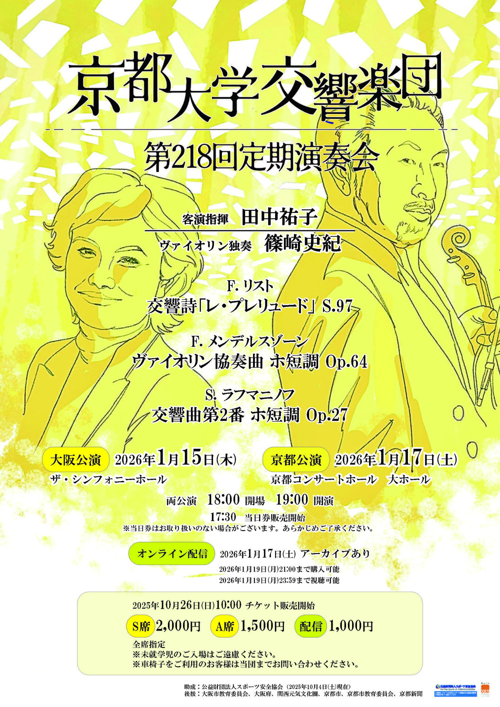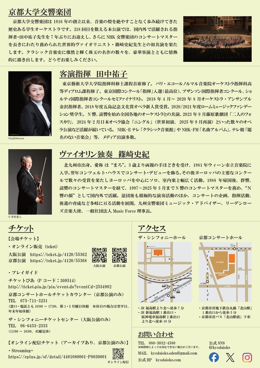 218回目を数える本公演では、国内外で活躍される指揮者・田中祐子先生を7年ぶりにお迎えし、さらにNHK交響楽団のコンサートマスターを長きにわたり務められた世界的ヴァイオリニスト・篠崎史紀先生との初共演を果たします。
