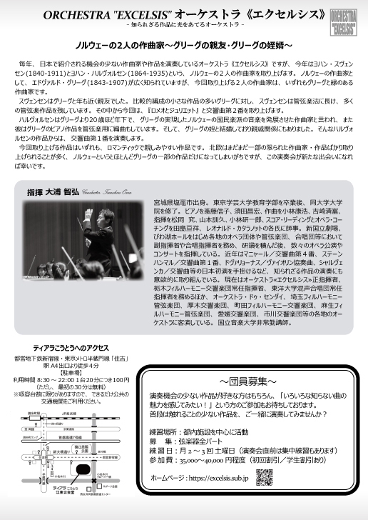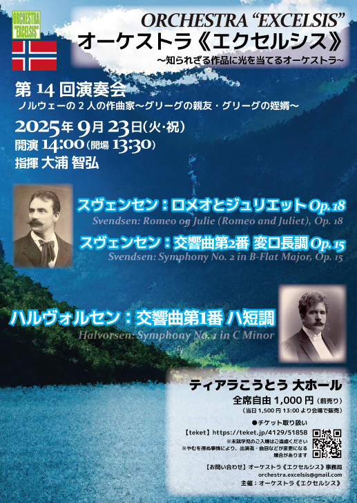 毎年、日本で紹介される機会の少ない作曲家や作品を演奏しているオーケストラ《エクセルシス》ですが、今年はグリーグの親友だったヨハン・スヴェンセンと、グリーグの姪婿ヨハン・ハルヴォルセンという、ノルウェーの2人の作曲家を取り上げます。広く知られているノルウェーの作曲家として、エドヴァルド・グリーグの名はすぐあがっても、他の作曲家の名前が出てくることは非常に少ないと思います。