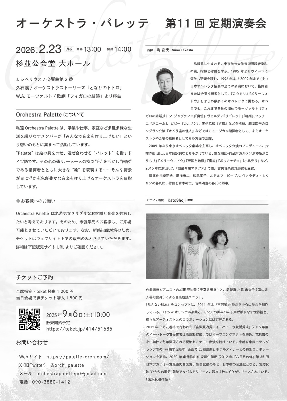誰もが聞いたことのある「となりのトトロ」をはじめ、シベリウスの「交響曲第2番」、モーツァルト「フィガロの結婚」より序曲といった物語のある曲でプログラムを構成しています。ぜひ会場でお楽しみいただければ嬉しいです!
