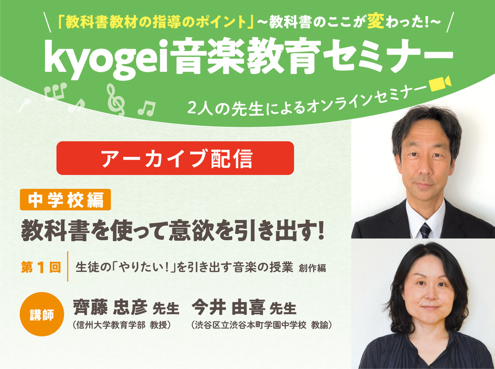 2022年11月27日(日)に開催された『kyogei音楽教育セミナー【中学校編】第1回「生徒の「やりたい!」を引き出す音楽の授業 創作編」』の録画映像をご覧いただけます。