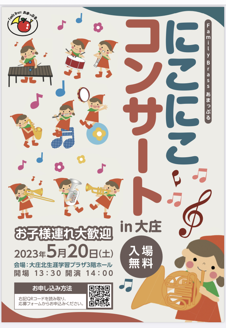 一般バンド時間が合わないし、小さい子がいると迷惑が掛かっちゃっうし・・・。 もう一度吹きたいけど 超・ブランクがあるし・・・ というママのために創立した吹奏楽団です。 みんなで交代で託児をしながら 楽しく練習しています。 またFamily Brassという名前の通り、家族で参加できる楽団 でありたいとの願いもあり、もう一度吹きたいという気持ちは パパさんも同じだということで、普段お仕事されてる方も参加 できるように平日だけでなく土曜日も活動をしています。 今では何組もの方がご家族で所属し活動されています。