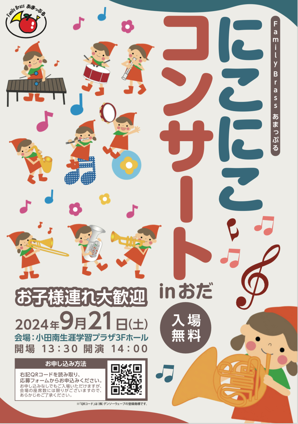 一般バンド時間が合わないし、小さい子がいると迷惑が掛かっちゃっうし・・・。 もう一度吹きたいけど 超・ブランクがあるし・・・ というママのために創立した吹奏楽団です。 みんなで交代で託児をしながら 楽しく練習しています。 またFamily Brassという名前の通り、家族で参加できる楽団 でありたいとの願いもあり、もう一度吹きたいという気持ちは パパさんも同じだということで、普段お仕事されてる方も参加 できるように平日だけでなく土曜日も活動をしています。 今では何組もの方がご家族で所属し活動されています。