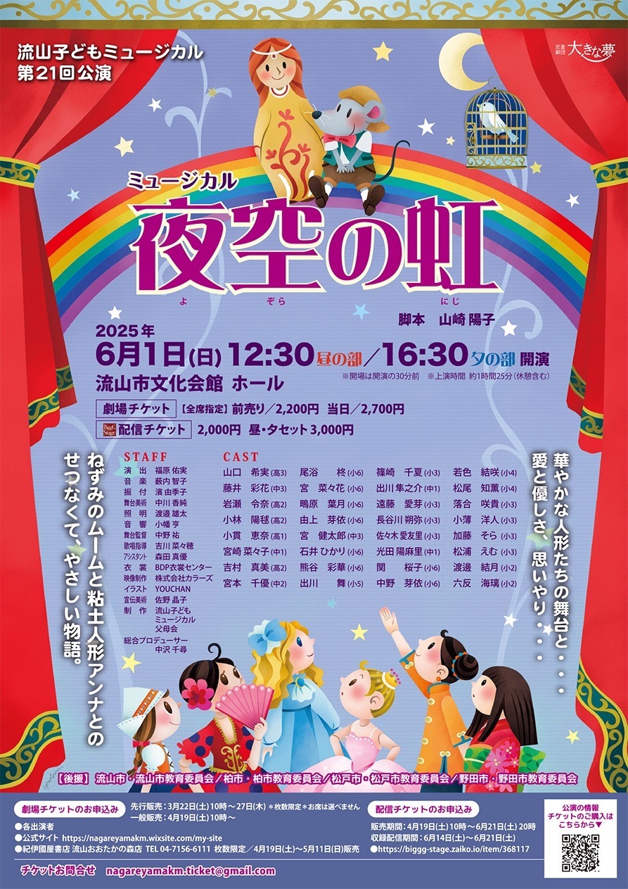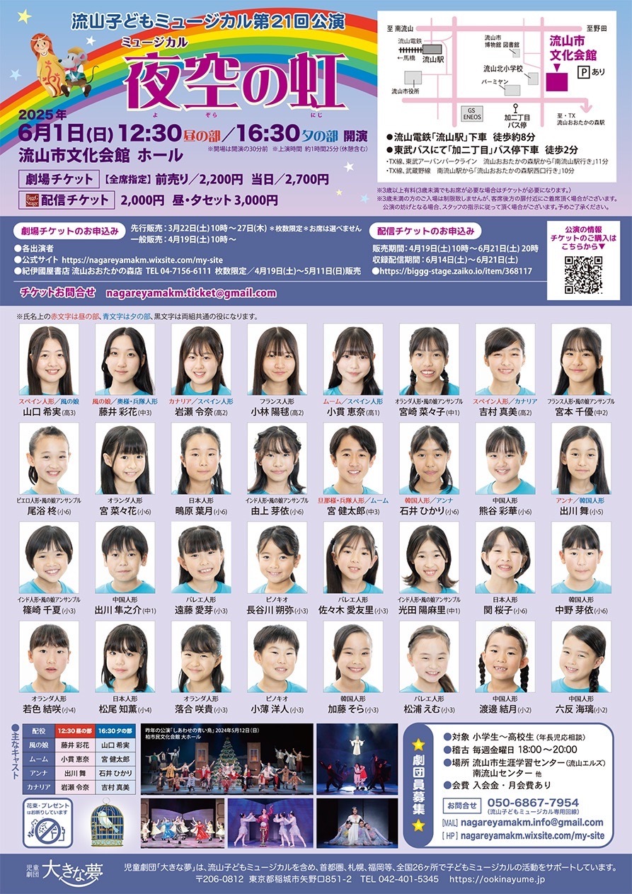 「流山子どもミュージカル」は、児童劇団「大きな夢」の支部として、2003年に発足しました。毎年春~夏に公演を重ね、おかげさまで2024年には節目となる第20回記念公演を大盛況で終えました。現在は流山市をはじめとして、柏市、松戸市、野田市などの小学生から高校生までの子ども達が、毎週金曜日、主に流山市生涯学習センターで歌やダンスの先生方をお招きしてレッスンを受けています。先生が初めから丁寧に教えてくださるので、ダンスや歌の経験がなくても大丈夫です。劇団のオリジナルの作品に出演することで演じられる喜び、楽しさ、達成感を共に味わうことができます。