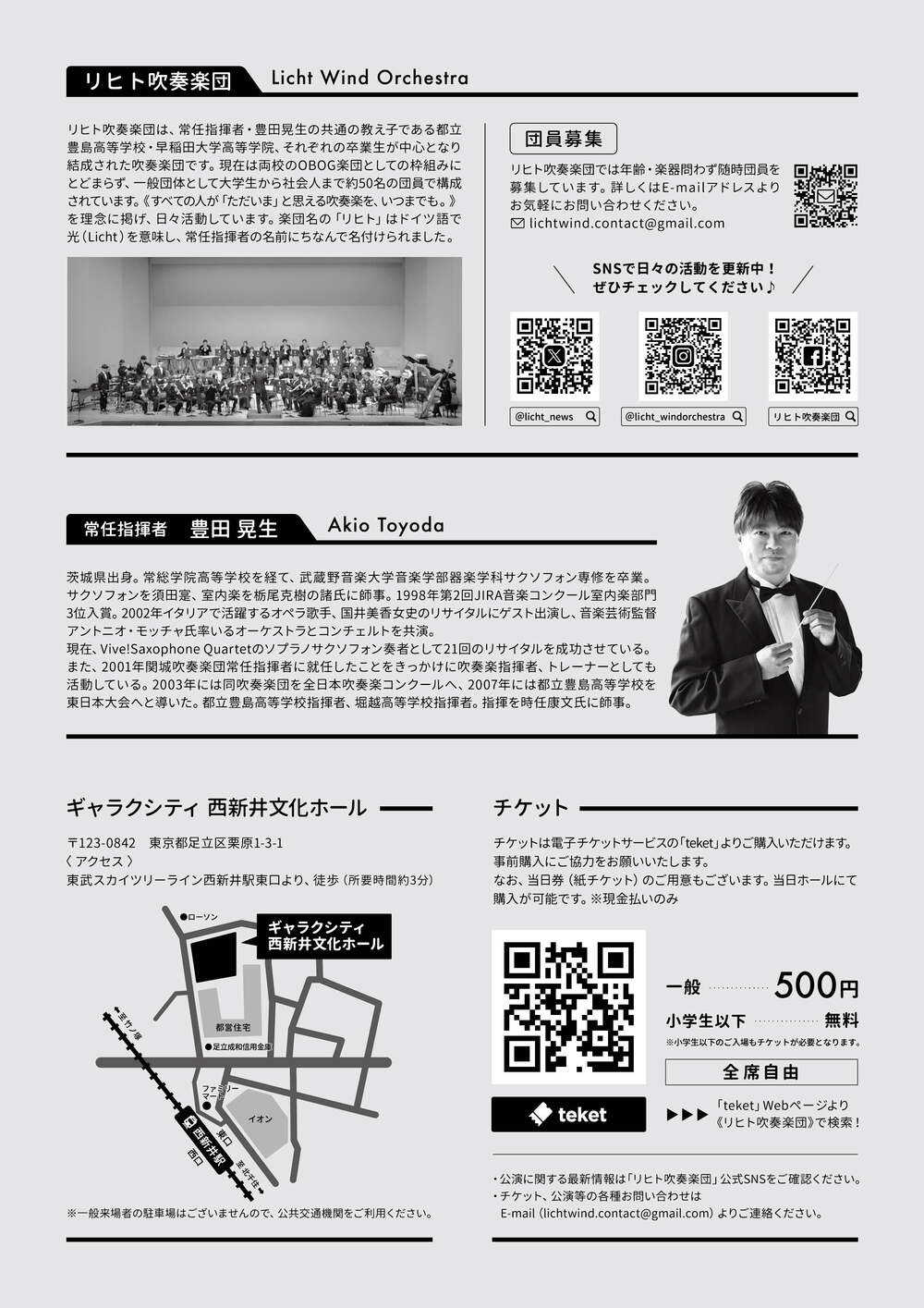 リヒト吹奏楽団は、常任指揮者・豊田晃生の共通の教え子である都立豊島高等学校・早稲田大学高等学院、それぞれの卒業生が中心となり結成された吹奏楽団です。現在は両校のOBOG楽団としての枠組みにとどまらず、一般団体として大学生から社会人まで約50名の団員で構成されています。《すべての人が「ただいま」と思える吹奏楽を、いつまでも。》を理念に掲げ、日々活動しています。楽団名の「リヒト」はドイツ語で光(Licht)を意味し、常任指揮者の名前にちなんで付けられました。