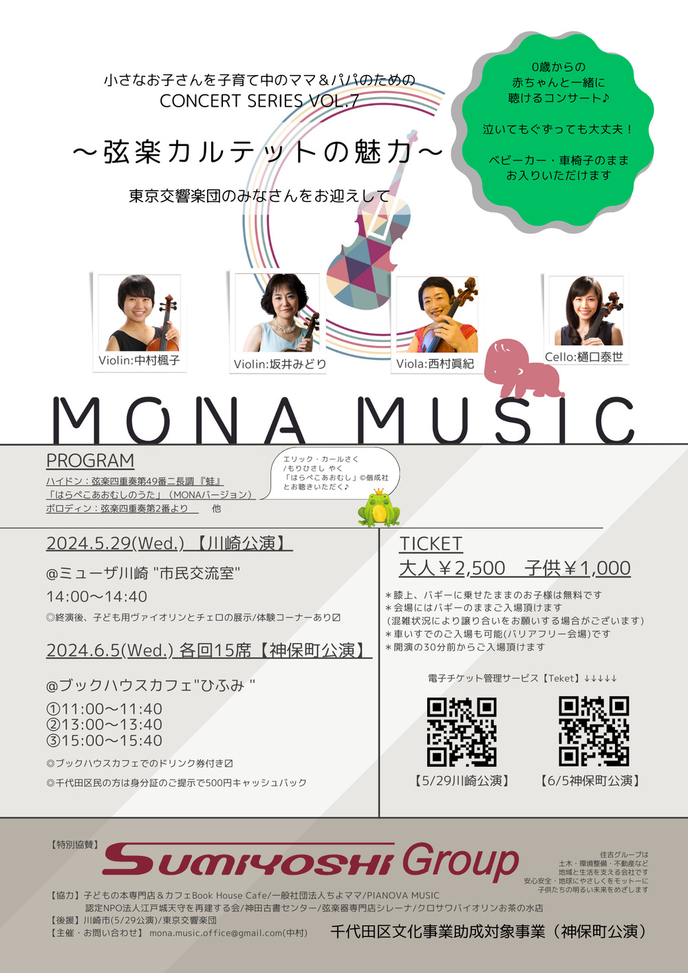 お子さんと一緒でも本格的なクラシックの演奏をお楽しみいただけるMONA MUSICの人気シリーズ第7回目は、東京交響楽団の皆さんをお迎えして、クラシック音楽の王道ともいえる弦楽カルテットをお届けします。大変豪華なこの機会をぜひお楽しみ下さい♪