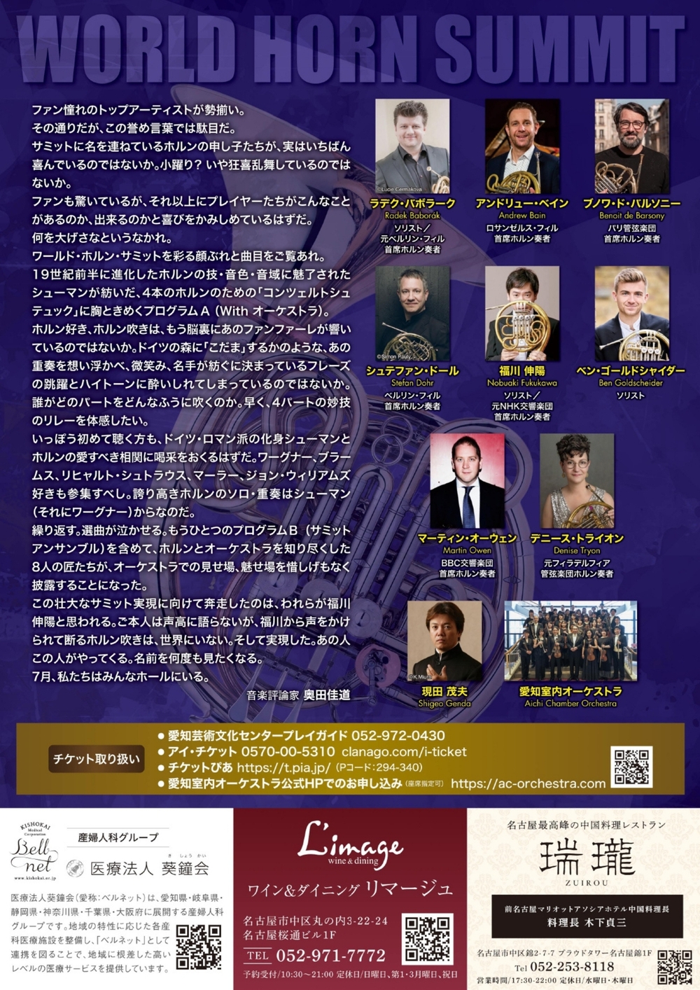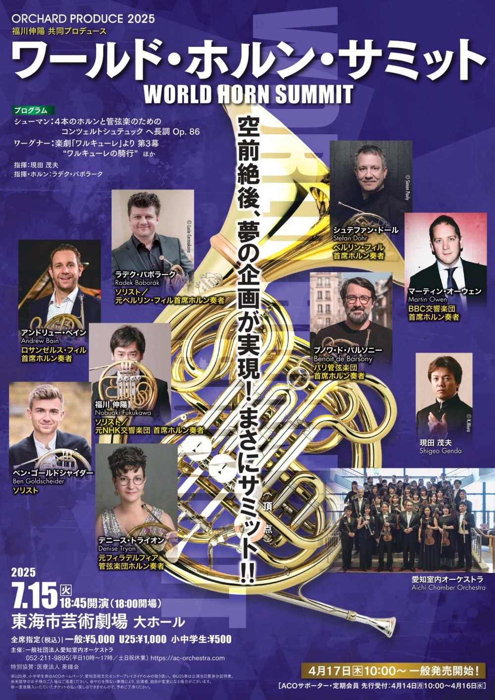 元NHK交響楽団首席ホルン奏者であり、国内外で活躍する福川伸陽の呼びかけに応えて、世界最高峰の奏者達が続々と集結します。
