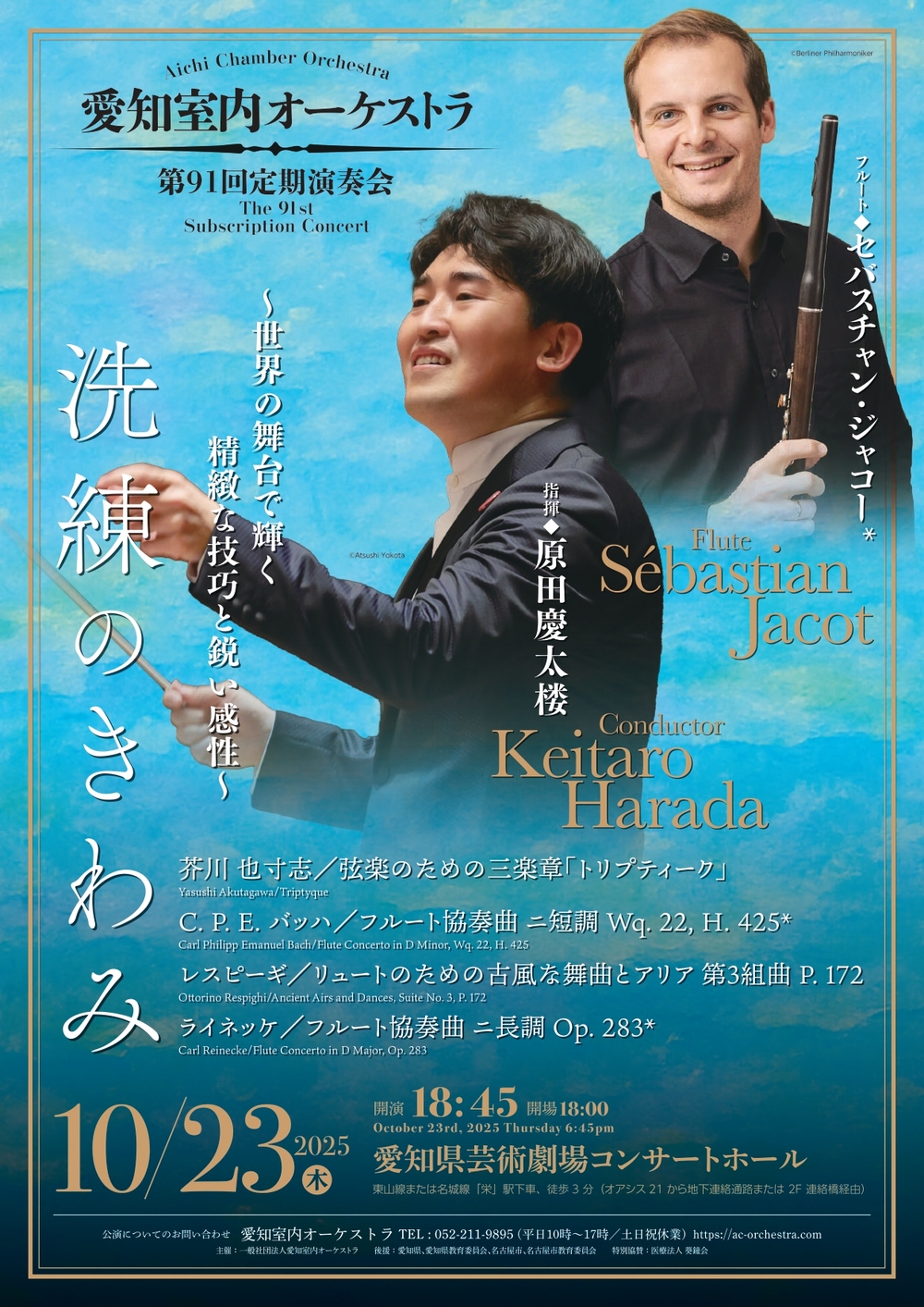 第91回定期演奏会は、アメリカ・ヨーロッパ・アジアを中心に目覚しい活躍を続けている指揮の原田慶太楼による、選りすぐりのプログラムで臨みます。今年生誕100年を迎える芥川也寸志の弦楽のための三楽章「トリプティーク」、有名曲シチリアーノを含む、レスピーギ「リュートのための古風な舞曲とアリア 第3組曲」、さらには、C.P.E.バッハ(有名なJ.S.バッハの次男坊)とライネッケのフルートコンチェルトを、若くしてベルリン・フィル首席奏者などを歴任したセバスチャン・ジャコーをソリストに迎え、奏でます。