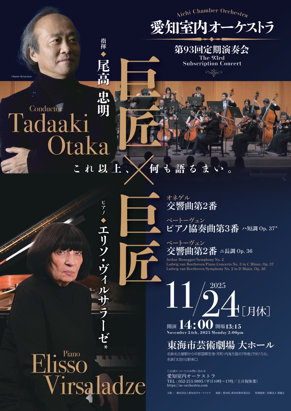 人間の魂がもつ、崇高なまでの強さを、オーケストラが深く響かせる選曲です。練達の名匠・尾高忠明(指揮)がメインに据えたのは、ベートーヴェンの〈交響曲第2番〉。翔び立たんばかりの生気に満ちた明るい傑作です。実は作曲家の耳の病気が深刻さを増していた頃の作品ながら、闇を微塵もみせない曲調は、深淵を見た人こその強さでしょうか。併せて、本作と同時に初演された〈ピアノ協奏曲第3番〉も。ハ短調の暝い情熱が美しくほとばしる傑作で、敬愛を集める巨匠ヴィルサラーゼが〈円熟の先にひらく境地〉を味わい尽くします。さらにオネゲルが大戦下に書いた〈交響曲第2番〉も。弦楽合奏が刻む陰鬱の果て、救いの光のように射すトランペットの響き…卓抜な選曲に織り込まれた〈魂〉の諸相を体感してください。