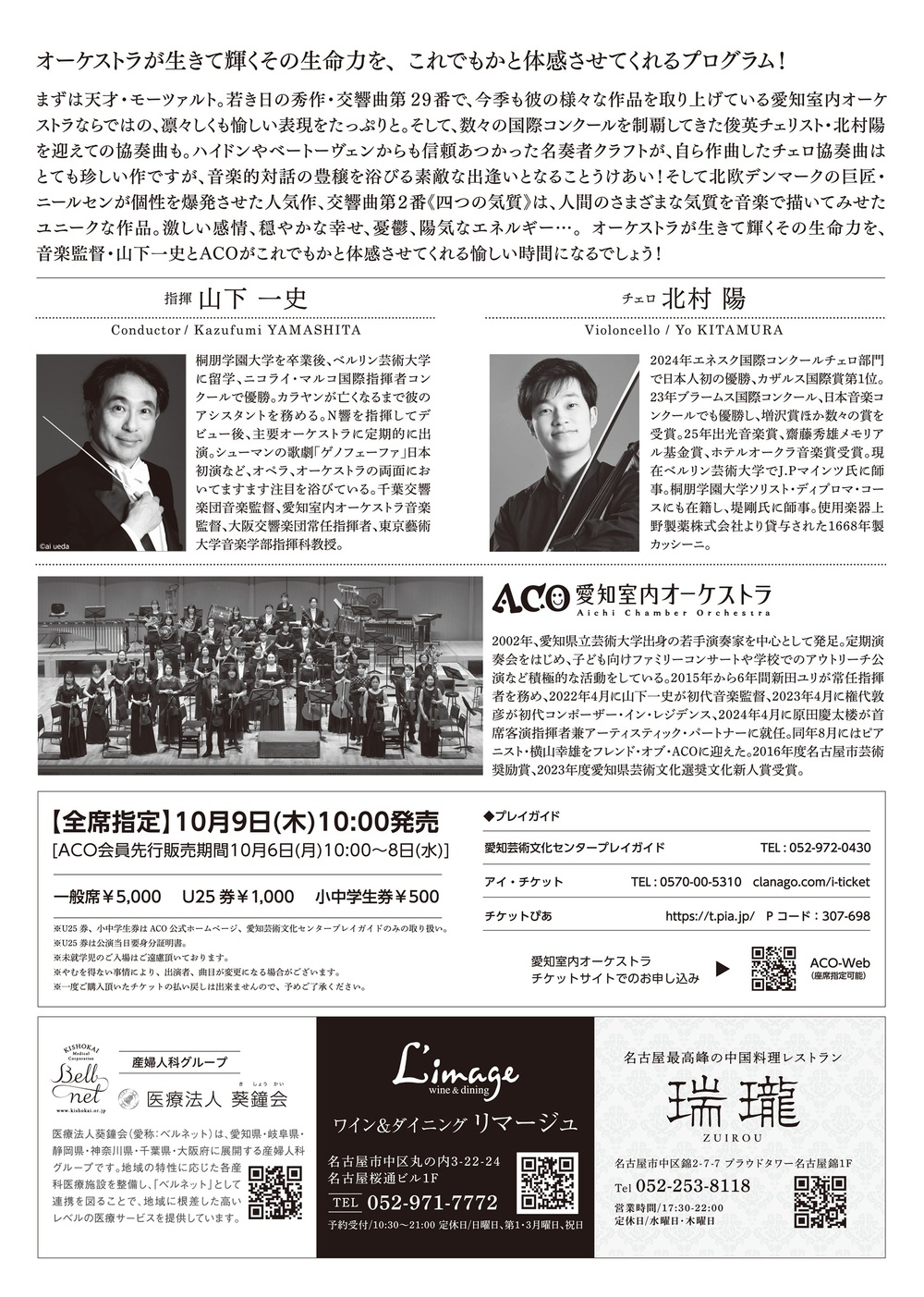 まずは天才・モーツァルト。若き日の秀作・交響曲第29番で、今季も彼の様々な作品を取り上げている愛知室内オーケストラならではの、凛々しくも愉しい表現をたっぷりと。そして数々の国際コンクールを制覇してきた俊英チェリスト・北村陽を迎えての協奏曲も。ハイドンやベートーヴェンからも信頼あつかった名奏者クラフトが、自ら作曲したチェロ協奏曲はとても珍しい作ですが、音楽的対話の豊穣を浴びる素敵な出逢いとなることうけあい!そして北欧デンマークの巨匠・ニールセンが個性を爆発させた人気作、交響曲第2番《四つの気質》は、人間のさまざまな気質を音楽で描いてみせたユニークな作品。激しい感情、穏やかな幸せ、憂鬱、陽気なエネルギー⋯。オーケストラが生きて輝くその生命力を、音楽監督・山下一史とACOがこれでもかと体感させてくれる愉しい時間になるでしょう!