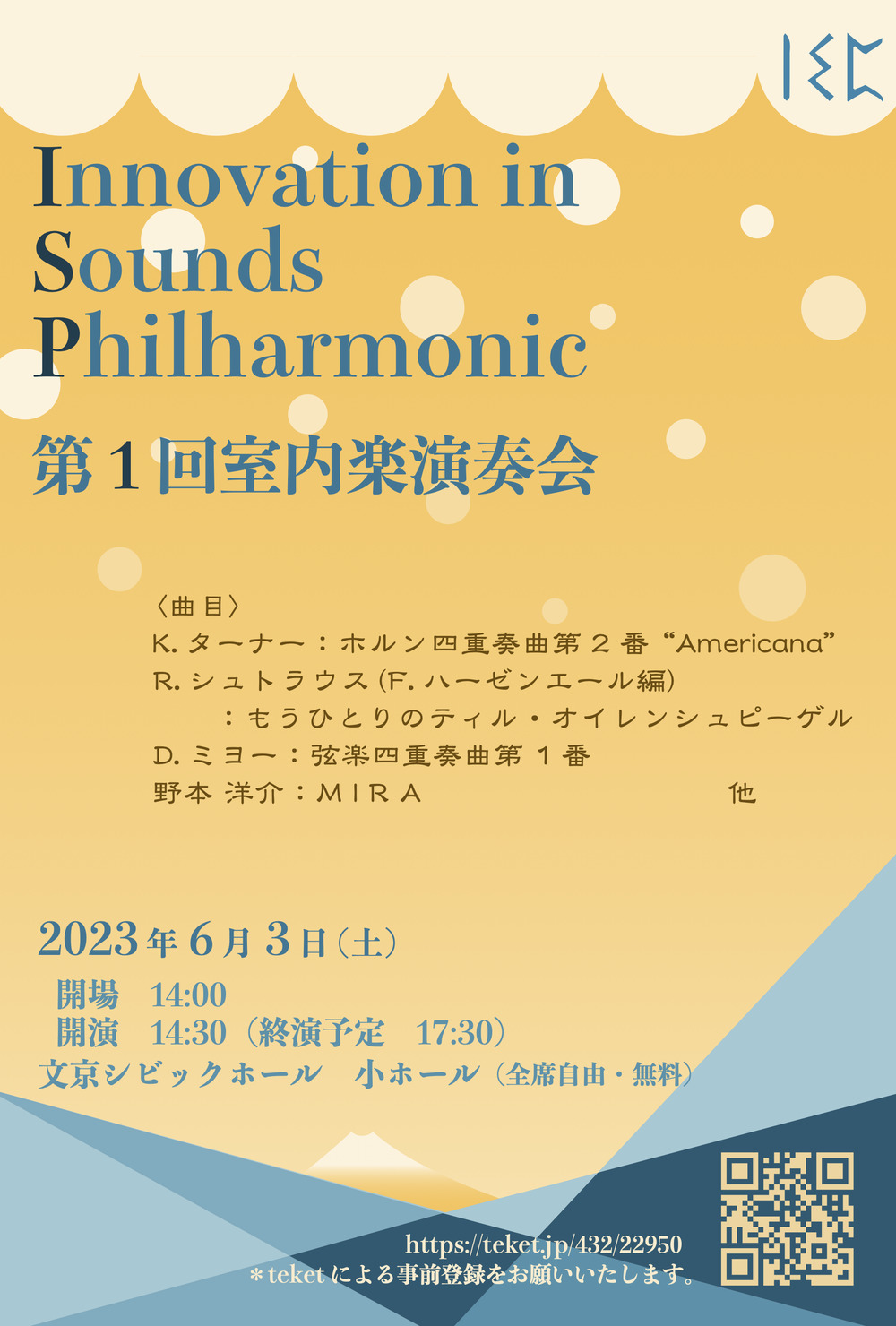 ISP(※)では、選曲や運営・広報などさまざまな側面で、常にその理念である「新しい価値視点を実験する」を体現してきました。コロナ禍を経験し、新メンバーを多数迎えたいま、当団の魅力をさらに内外に広めるべく、団として初めての試みとなる室内楽演奏会を開催いたします。