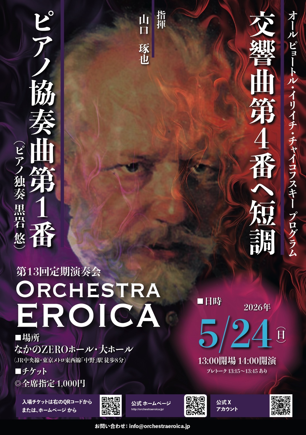 Orchestra EROICA 第13回定期演奏会は、オールチャイコフスキープログラム。創作時期が近い中でチャイコフスキーの才能が花開いていった2作品を取り上げます。ピアノ協奏曲のソリストには初共演となる黒岩悠氏をお迎えしてお送りします。また、交響曲第4番は、ロシア音楽をこよなく愛する指揮者の本領発揮となるでしょうか。