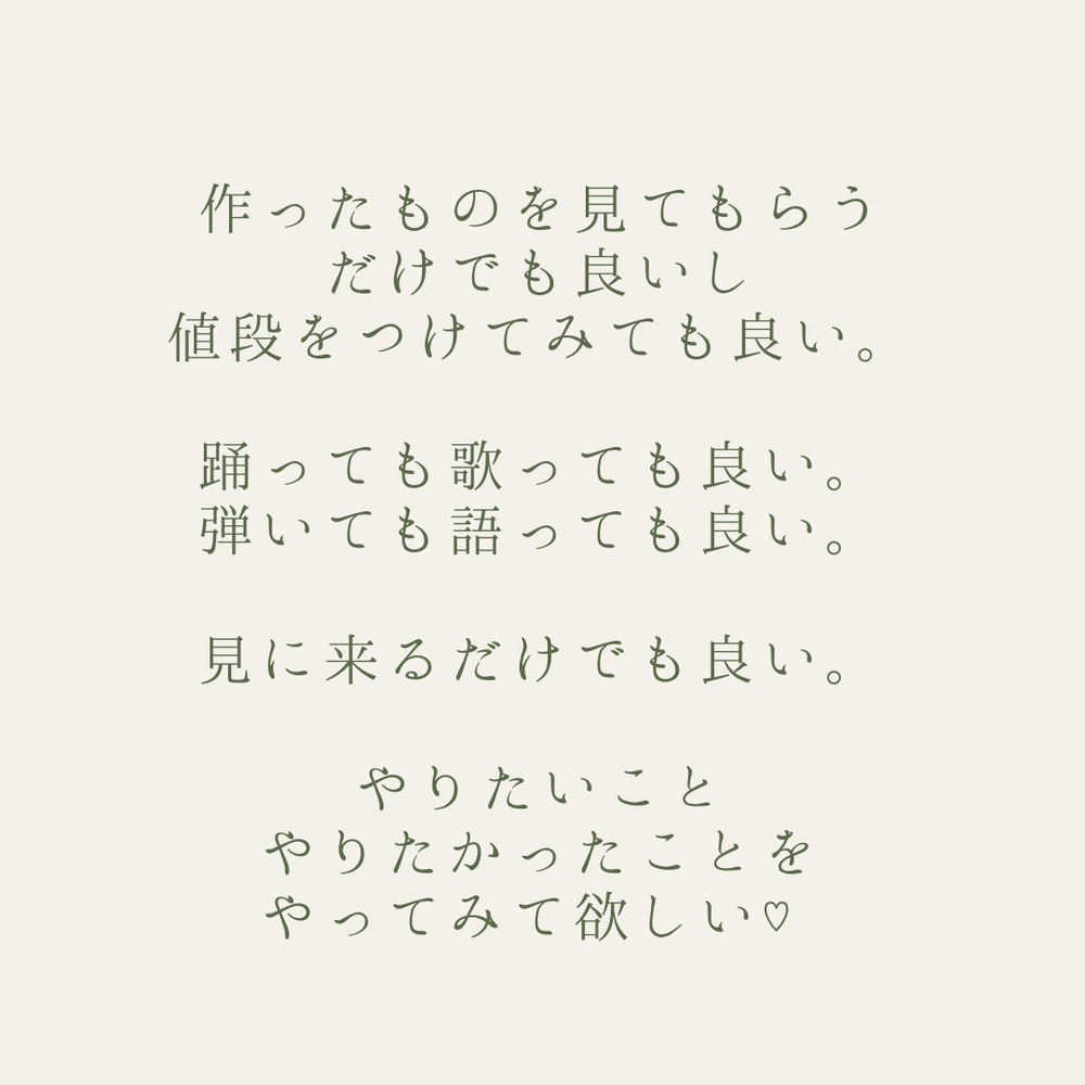 大人も子どもも、好きなことをSNSではなくリアルの場で見てもらいましょう!展示でも販売でも出演でも!歌っても踊ってもOK!なんでもOK!とにかく好きを見てもらうだけ!