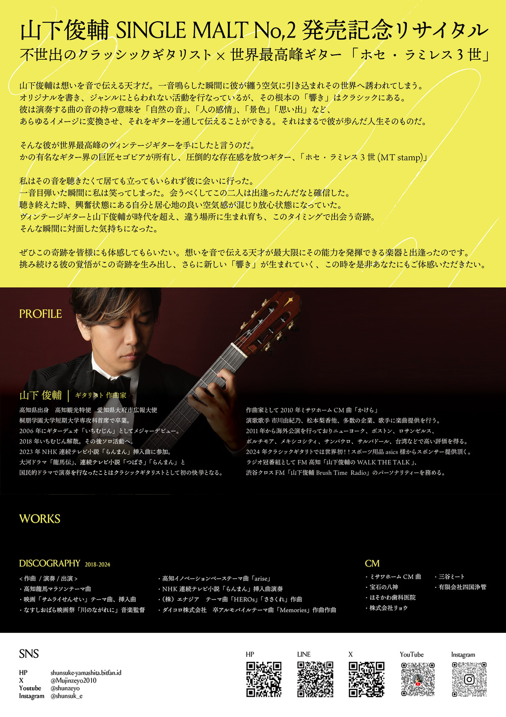 山下俊輔は想いを伝える天才だ。彼が纏う空気に惹き込まれギターを掻き鳴らした瞬間にその世界へ誘う。オリジナル、カバーとジャンルレスな活動を行なっているが、その根本に流れる「響」はクラシックにある。音の持つ意味を「自然の音」、「人の感情」、「景色」「思い出」に変換させ、それは彼が歩んだ人生そのものでありそれがギターを通して伝わってくる。