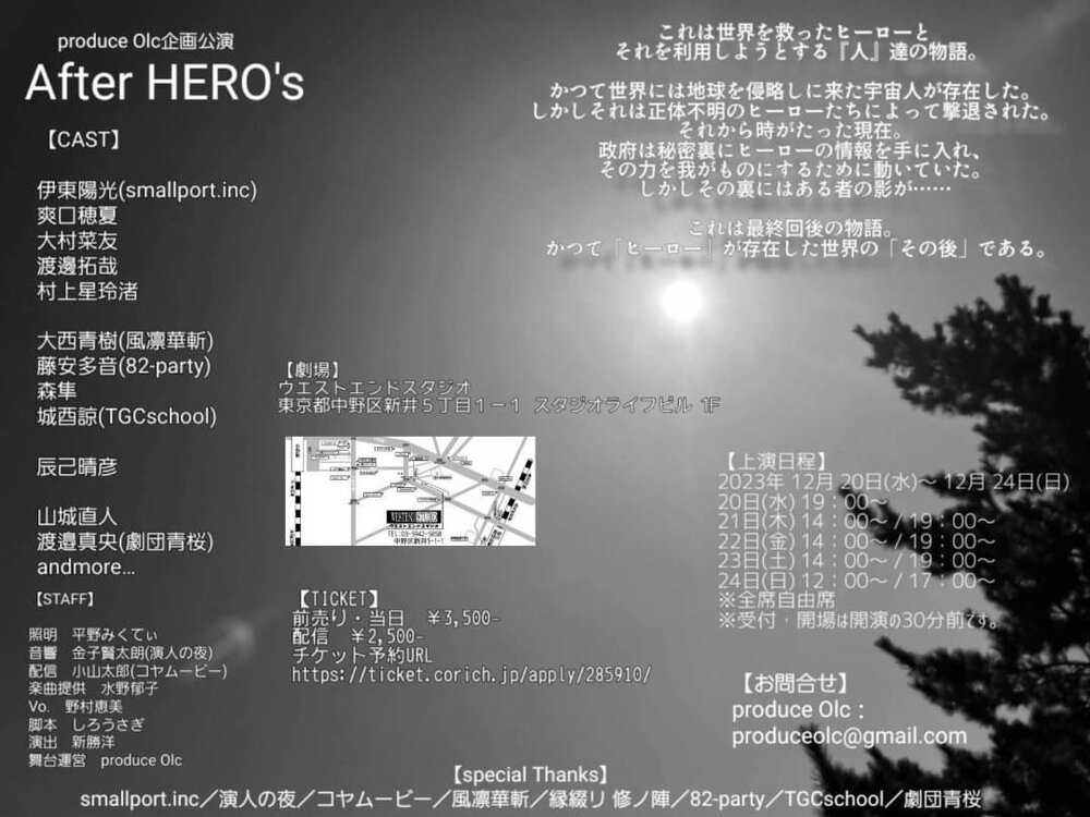 2023年12月20日(水)~12月24日(日)にウエストエンドスタジオで行われた、ProduceOlc 企画公演『After HERO‘s』のアーカイブ配信です。