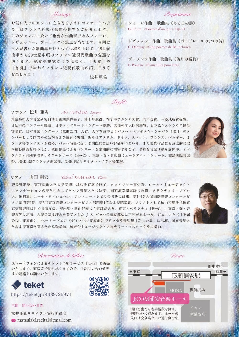 嗅覚を刺激されるようなフランス歌曲の世界へ是非お越しください。ホールでお会いできますこと、心からの楽しみにしています。松井亜希