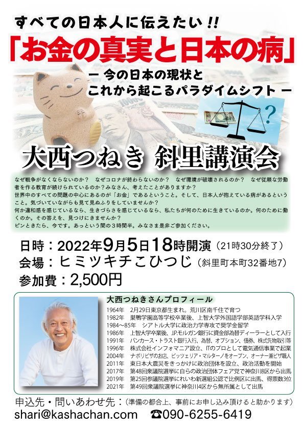 今だからこそ、私たちを縛る”お金”について、経済と政治の革命児・大西つねきが、ちょっと違う扉を覗かせてくれます。
