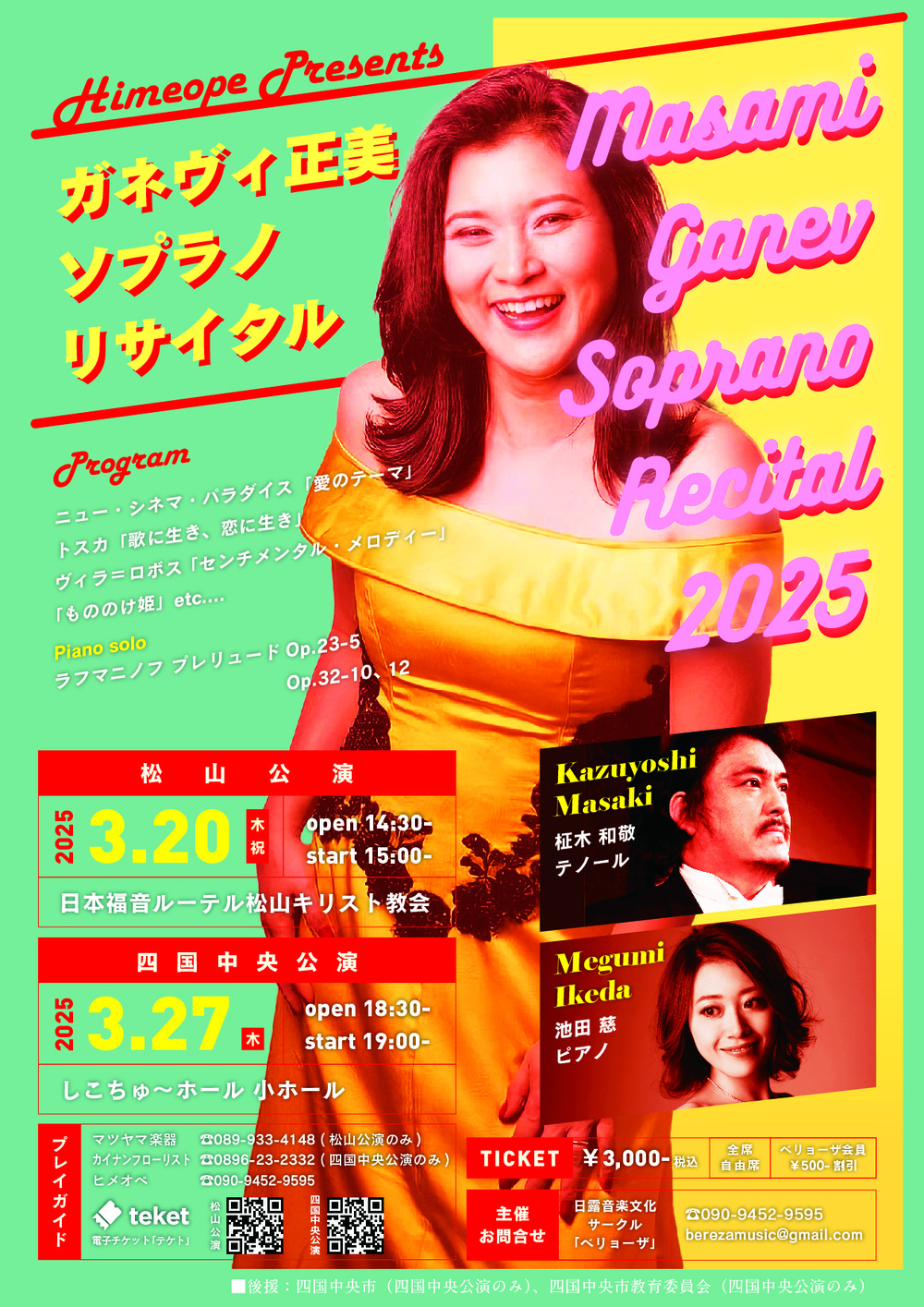 ブラジル在住のオペラ歌手・ガネヴィ正美が素晴らしい仲間を引き連れて愛媛に帰ってきます!親しみやすい曲から本格的なオペラアリアまで、歌の世界にどっぷり浸かれるコンサート。