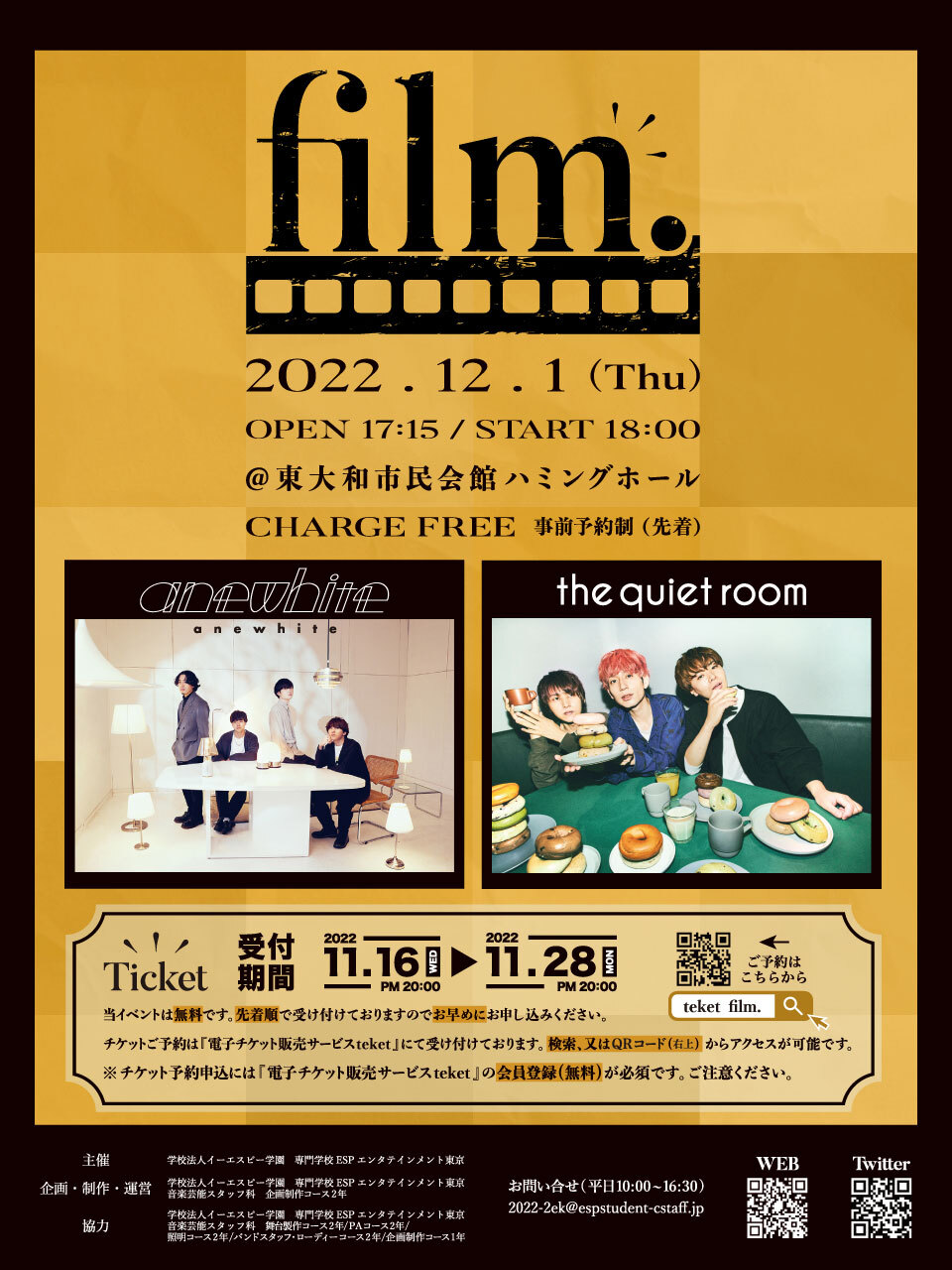 ・入場時に「teketの電子チケット」をご確認させていただきますので、お申し込み時に送信されるチケット情報確認メールのQRコードをご用意の上スタッフのご案内をお待ちください。