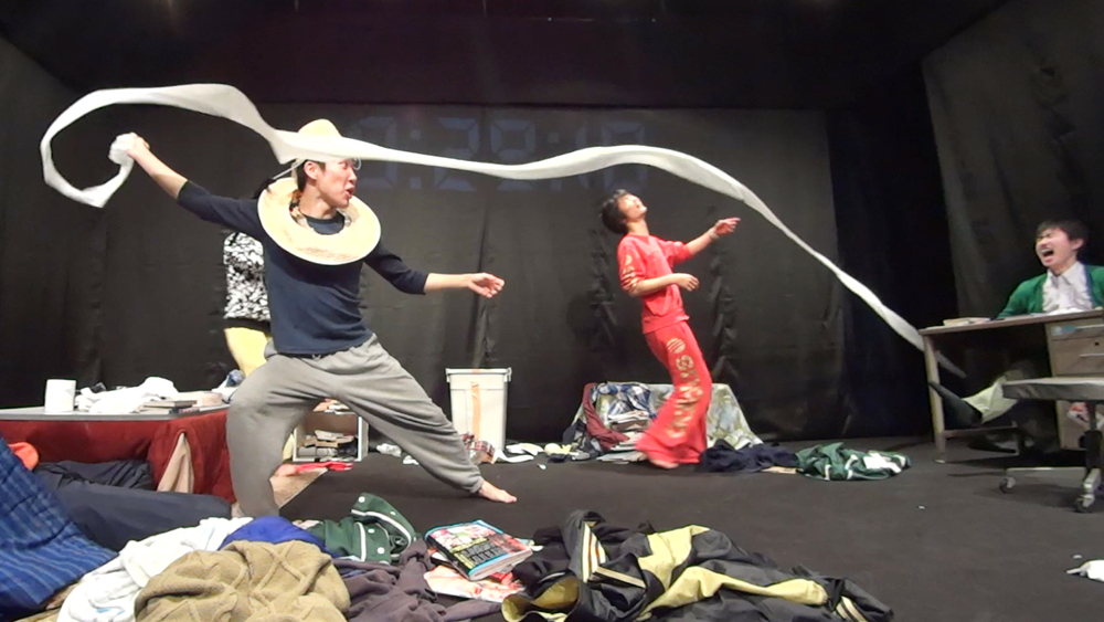 そういうことを考えていたとき、とうほく学生演劇祭(2014年9月)の上演時間が45分以内という制限があると聞いたので、どうせなら45分ジャストで終わらせてやろうと企み、その企みだけで、このお芝居は作られました。舞台の奥にデジタルのカウントダウンが出てて、それを役者がチラチラ見ながら、うわ、あと10分しかないぞ、とか言いながらお客さんと一緒に焦る、みたいなお芝居になったらおもしろいなあと。