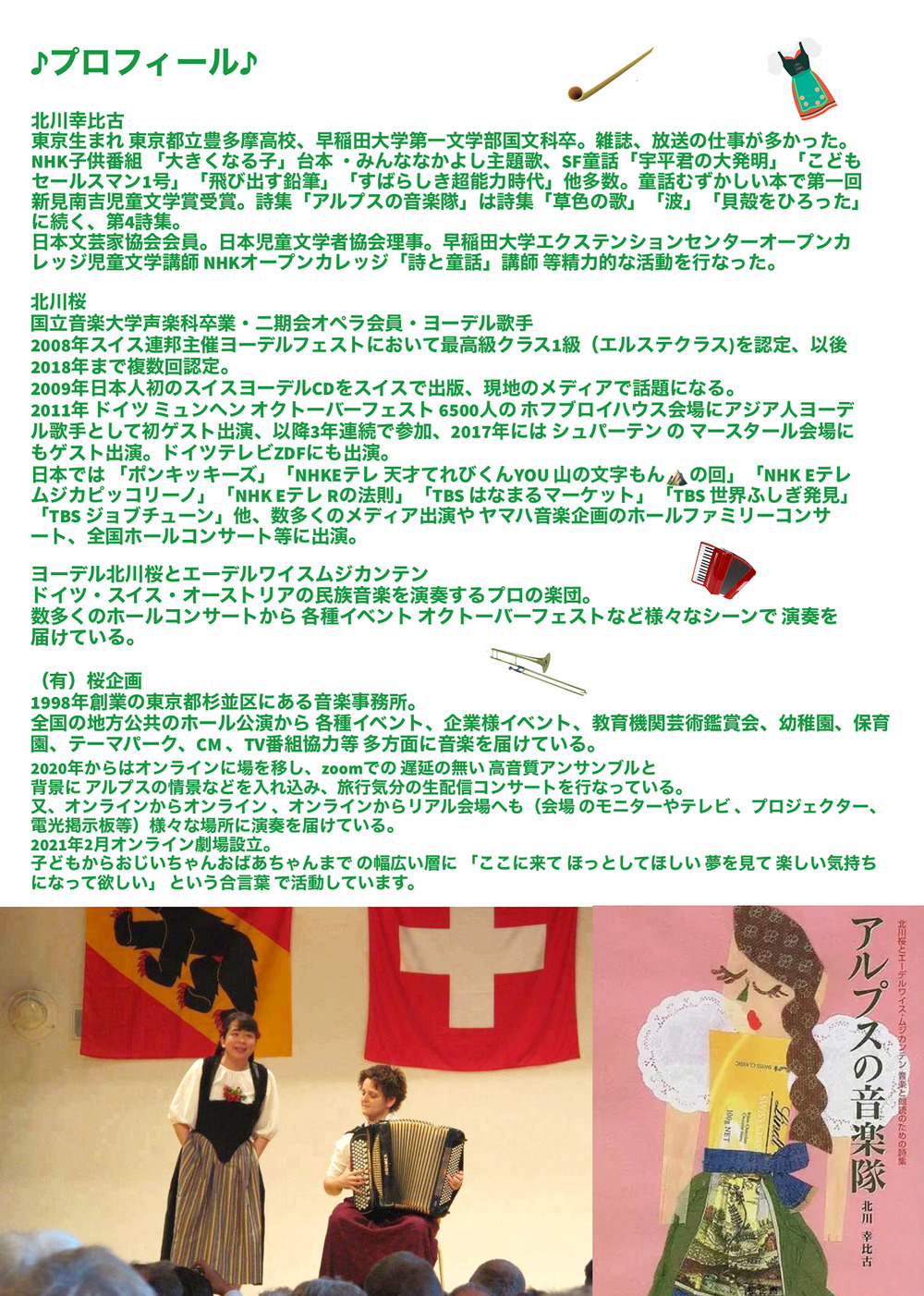 「アルプスの音楽隊」というヨーデル北川桜とエーデルワイスムジカンテンの為に書かれた詩集を読みつつ、本場仕込みの生ヨーデル・アルプス音楽をお届けするコンサートになります。