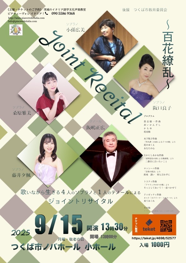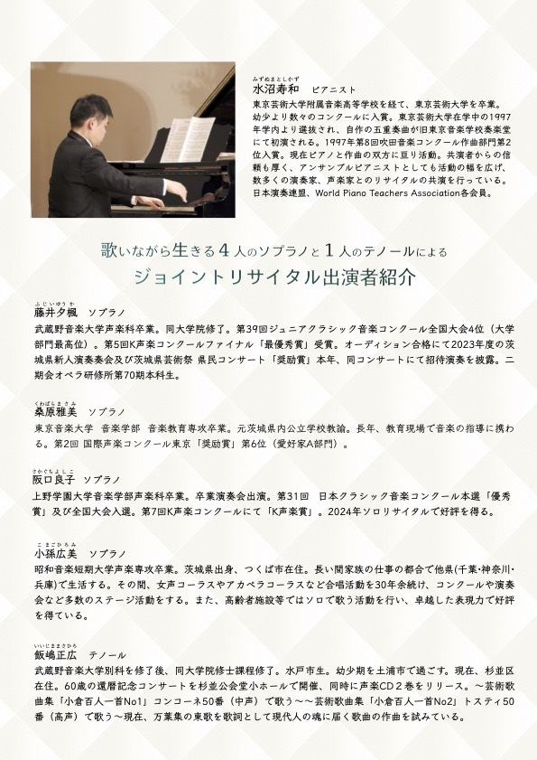 ソプラノ 小孫広美 阪口良子 桑原雅美 藤井夕楓 テノール 飯嶋正広 ピアニスト 水沼寿和