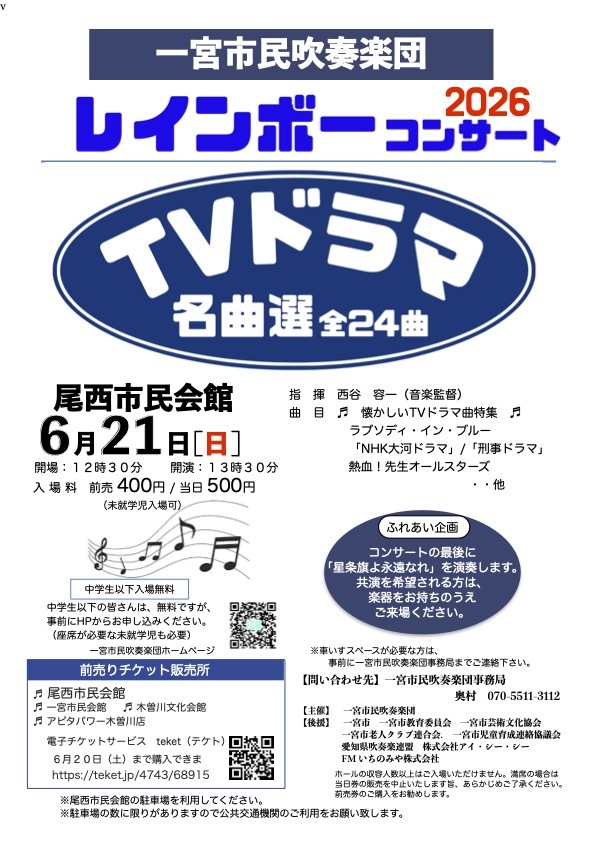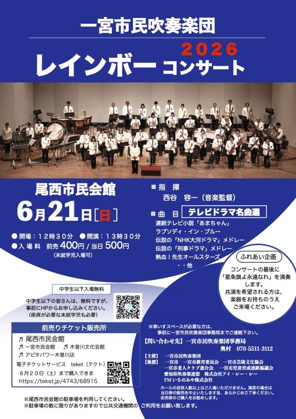 一宮市民会館が改修のため会場が「一宮市尾西市民会館」に変わります。ここでの、演奏会は初めて!新しい響きをお楽しみください。