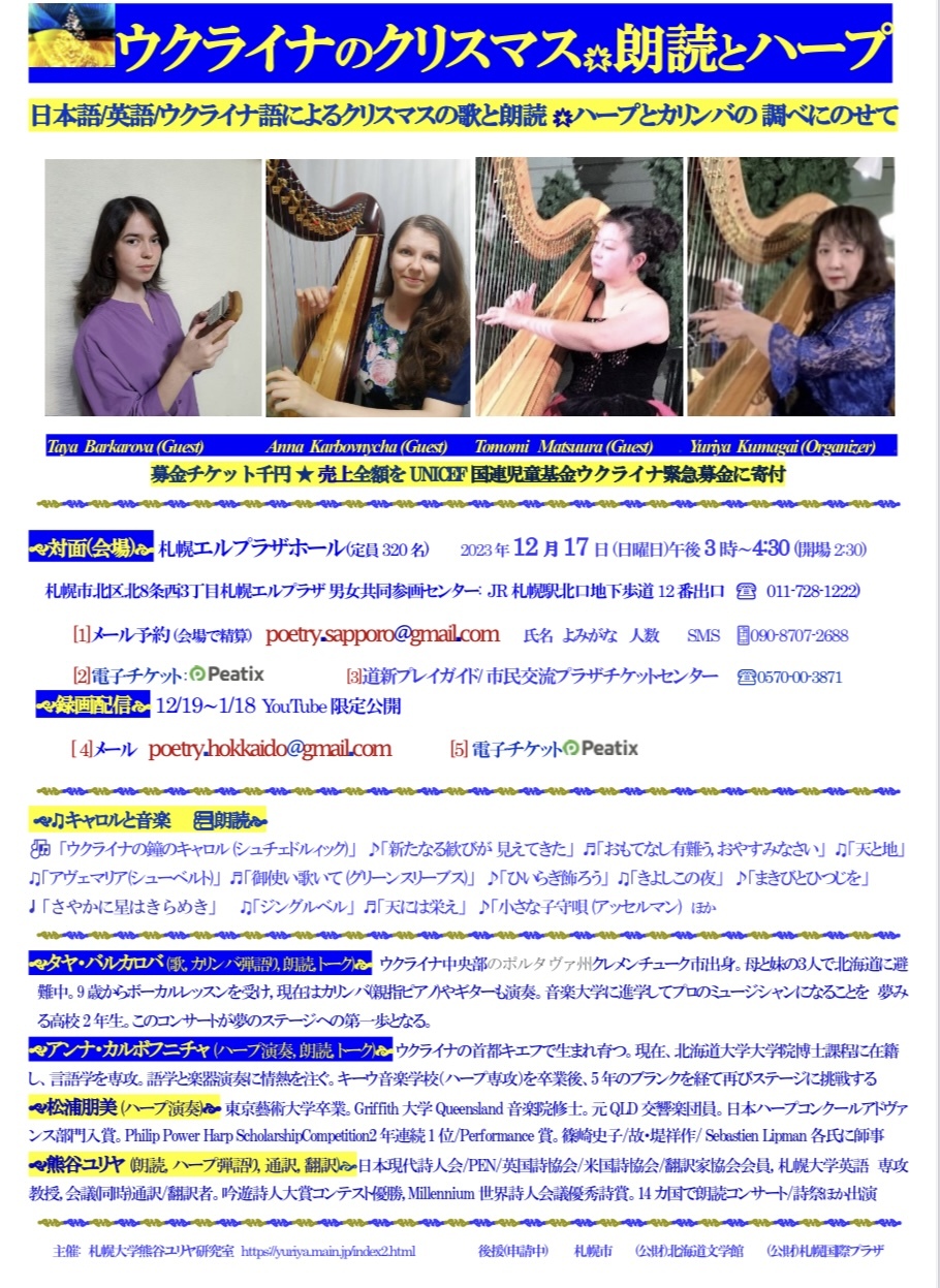 熊谷ユリヤ (トーク, 朗読, ハープ弾語り, 通訳, 翻訳)日本現代詩人会/PEN/英国詩協会/米国詩協会/翻訳家協会会員, 札幌大学英語 専攻教授, 会議(同時)通訳/翻訳者。吟遊詩人大賞コンテスト優勝, Millennium世界詩人会議優秀詩賞。14カ国で朗読リサイタル/詩祭出演