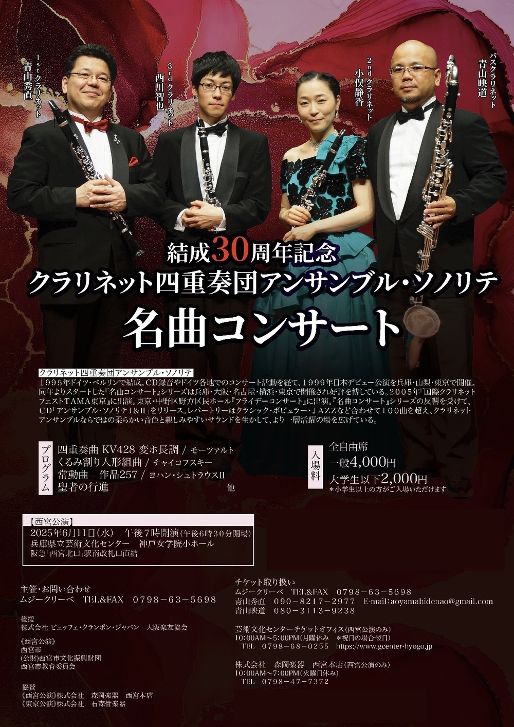 クラリネット四重奏団アンサンブル・ソノリテは2025年に結成30周年を迎えます。
