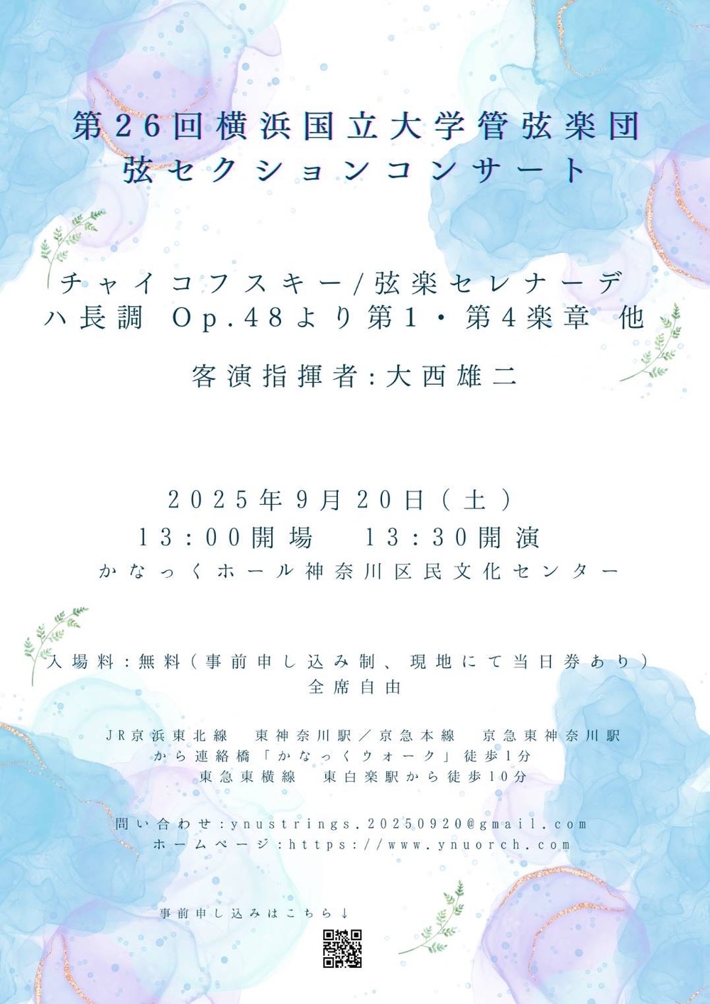 横浜国立大学管弦楽団は、1959年3月に設立されました。年2回の定期演奏会を中心に、各セクション(弦、管打)によるコンサートや、 小学校や福祉施設での移動音楽会、卒業式・入学式や大学祭での演奏など、多岐にわたって活動しています。 過去に、家田厚志、岩村力、 海老原光、長田雅人、川瀬賢太郎、河地良智、栗田博文、現田茂夫、甲賀一宏、坂本和彦、佐々木新平、 白谷隆、田中健、田部井剛、十束尚弘、冨平恭平、新田ユリ、林紀人、松尾葉子、松岡究、山岡重信、山下一史、 渡邊一正、和田一樹(五十音順、敬称略)の各氏らと共演しています。