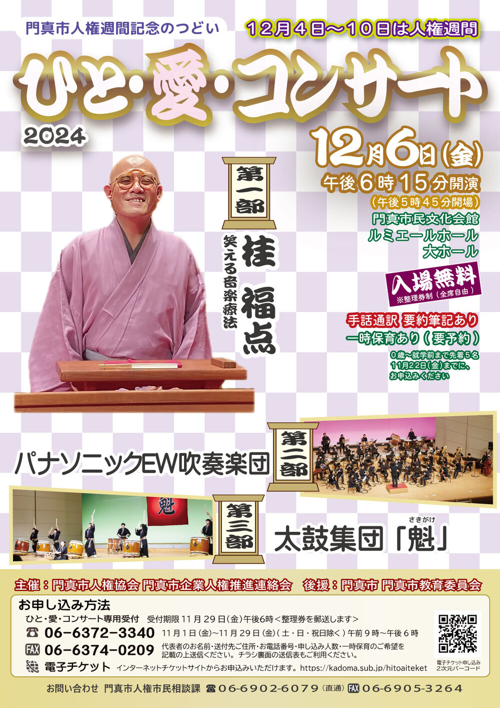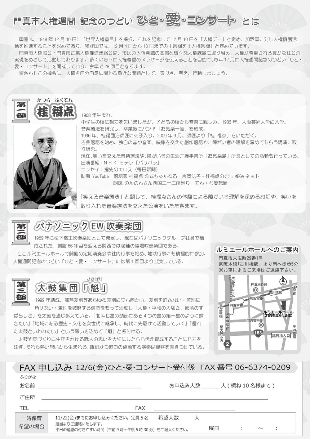 門真市人権協会・門真市企業人権推進連絡会は、市民の人権意識の高揚と様々な人権課題に取り組み、人権が尊重される豊かな社会の実現をめざして活動しております。多くの方々に人権尊重のメッセージを伝えることを目的に、毎年12月に人権週間記念のつどい「ひと・愛・コンサート」を開催しており、今年で28回目となります。