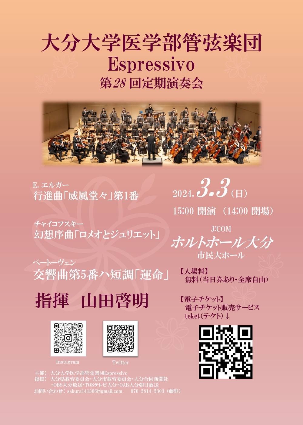 大分大学医学部管弦楽団 Espressivoは大分大学 挾間キャンパスで活動している学生オーケストラです。 医学部の学生だけでなく、旦野原キャンパス、大分県立看護科学大学等より構成される部員をはじめ大学・医療関係者、大分交響楽団など、 数々の学生オーケストラを支援してくださる方々により支えられております。 これからもさらなる発展を目指し日々邁進していきますので、よろしくお願いします。