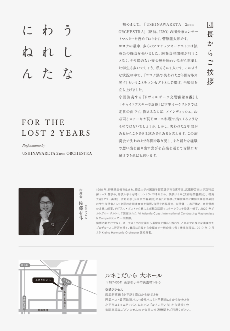 演奏の場を失われた学生や学生だった社会人の中で、再び同じ意思を持った若者たちが集結したオーケストラ。彼らの思いが募ったダブルメインの演奏会をどうぞご堪能ください♪