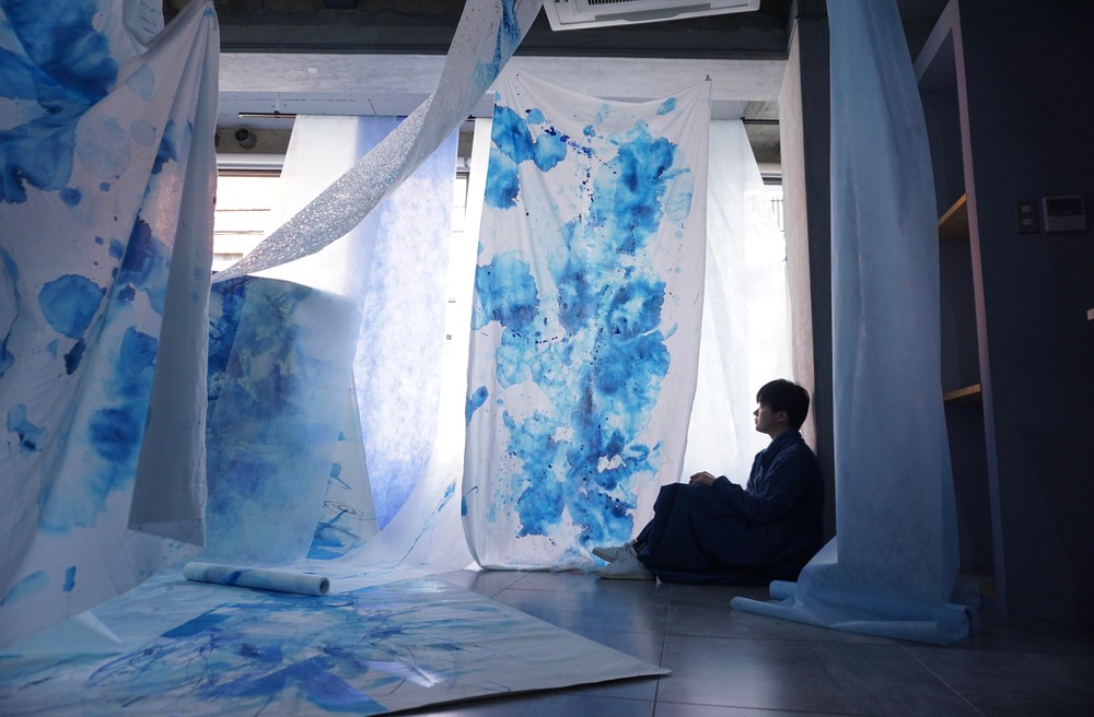 何層にも絵具を積み重ね、その絵具から現れる像を俯瞰することで様々な気づきがある。空や海のように、物事の向こう側を意識させる表情豊かな青を使い”Ginsoda Blue”シリーズを中心に様々な時間軸の作品を発表している。
