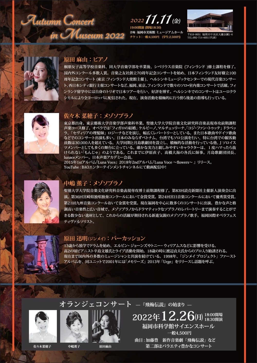 前半はフィンランドで研鑽を積み福岡をはじめ日本国内外で活躍するピアニスト、原田麻由のピアノソロををご堪能頂く。後半はドラムと声楽が参加し、クラシック音楽にドラムのリズムが加わった新しい音楽をお届けする。