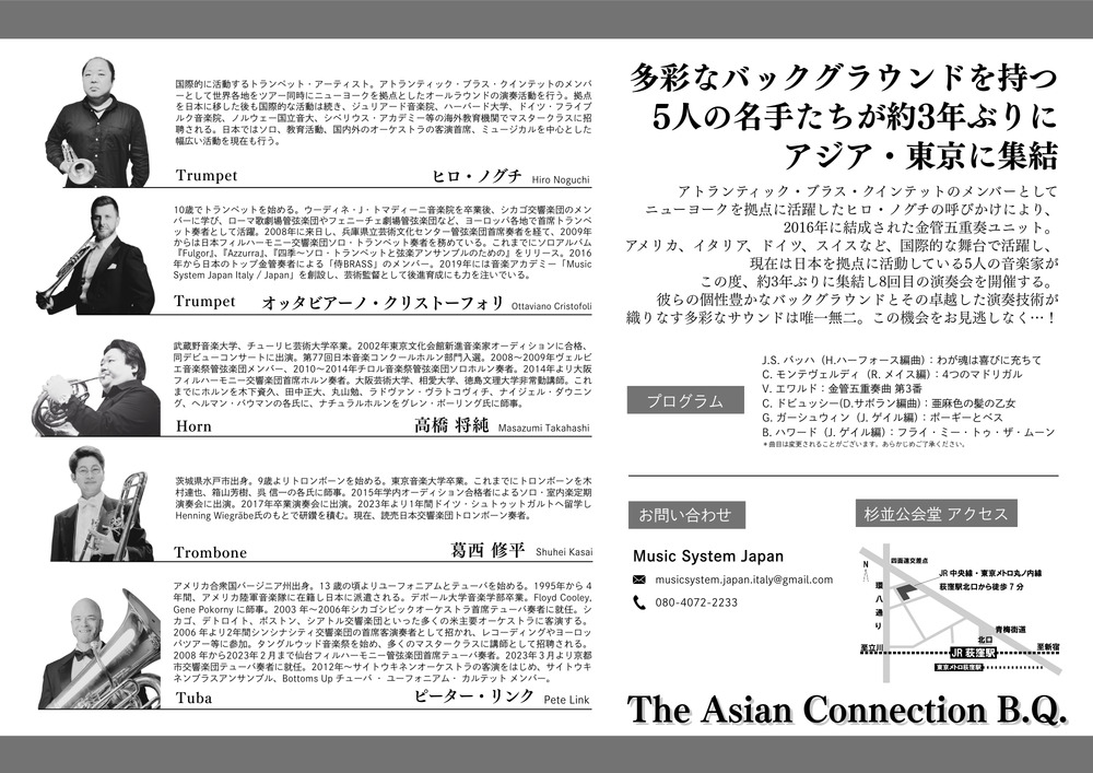 アトランティック・ブラス・クインテットのメンバーとしてニューヨークを拠点に活躍したヒロ・ノグチの呼びかけにより、2016年に結成された金管五重奏ユニット、アジアン・コネクション ブラス・クインテット。
