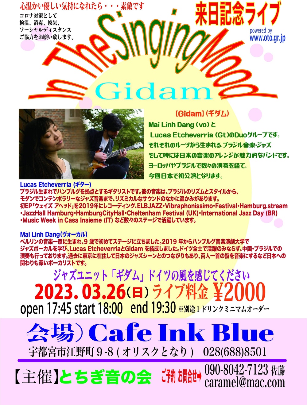 Mai Linh Dang (voc) と Lucas Etcheverria (git)のDuoグループの「Gidam」の音楽は、彼女らのルーツから生まれる、ブラジル音楽・ジャズ・そして時には日本の音楽のアレンジが魅力的なバンドです。ヨーロッパやブラジルで数々の演奏を経て、今回日本で初公演となります。