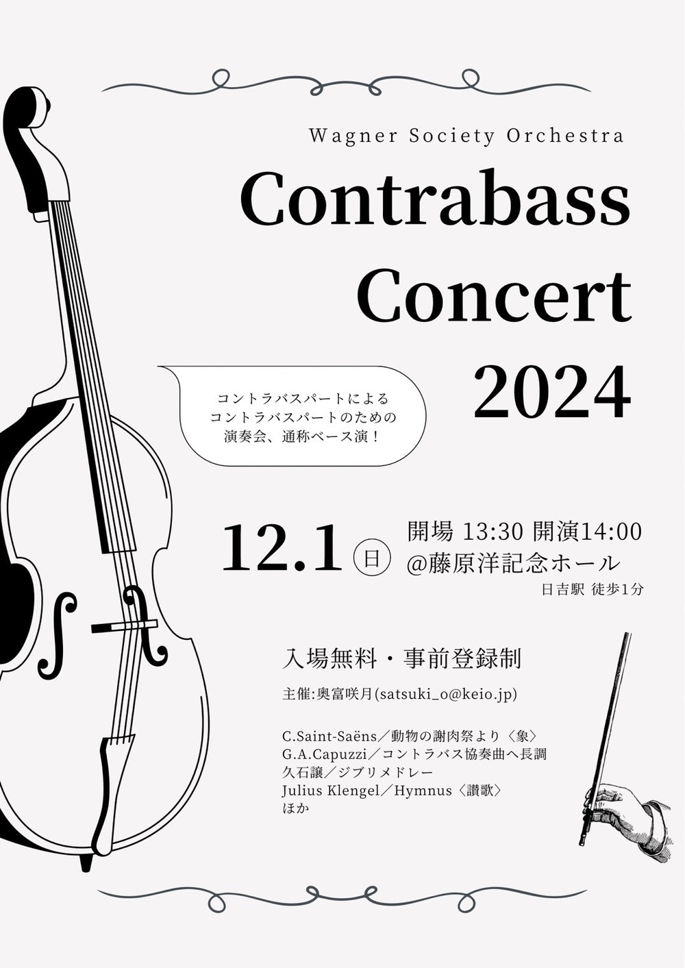 本演奏会は、ワグオケのコントラバスパートによる、コントラバス中心の一風変わった演奏会です。前半の第一部ではポップスを中心としたアンサンブルを、後半の第二部ではソロ曲を演奏し、コントラバスの魅力をたっぷりとお届けします。
