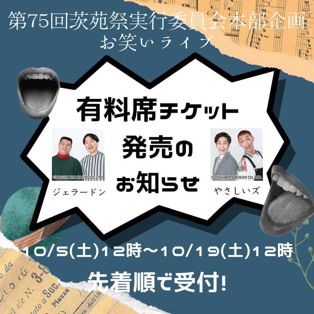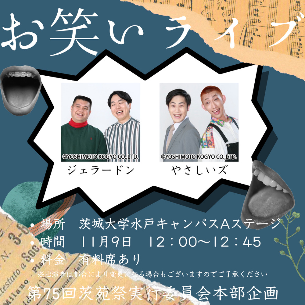 茨苑祭1日目11/9(土)12:00~12:45 水戸キャンパス正門入ってすぐのAステージ(雨天時は講堂)でジェラードンさんとやさしいズさんがお笑いライブをしてくれます!ネタ披露のあとじゃんけん大会をしてくれます!