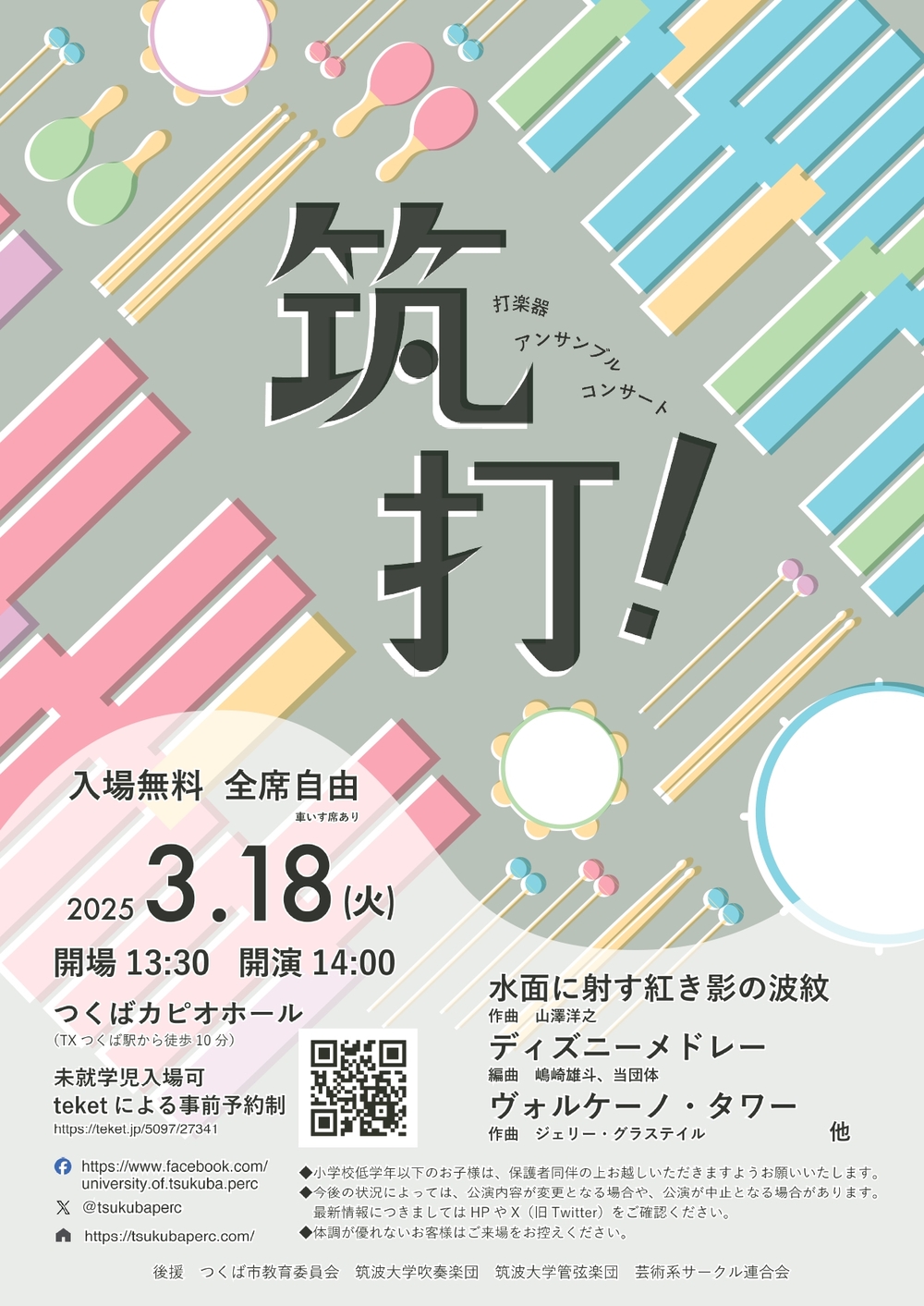 筑打!は、筑波大学吹奏楽団・筑波大学管弦楽団打楽器パート所属メンバーを中心とする、筑波大学の学生およびOBOGの打楽器奏者によって構成される団体です。打楽器や打楽器アンサンブルの魅力を地域住民や近隣学校の児童・生徒の皆様に伝えることを目的とし、年1回のコンサートを中心に活動しています。