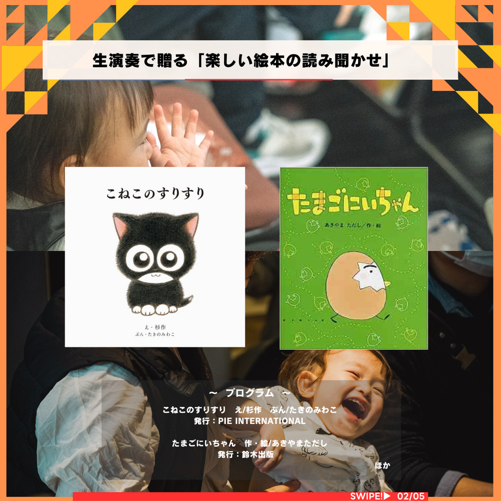0歳から楽しめる絵本の読み聞かせと、コンサートをお届けします♪