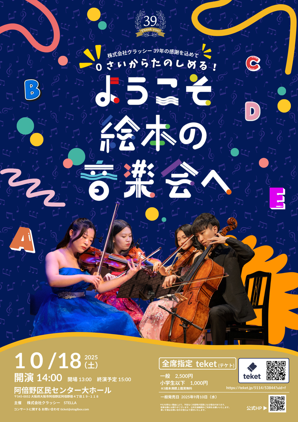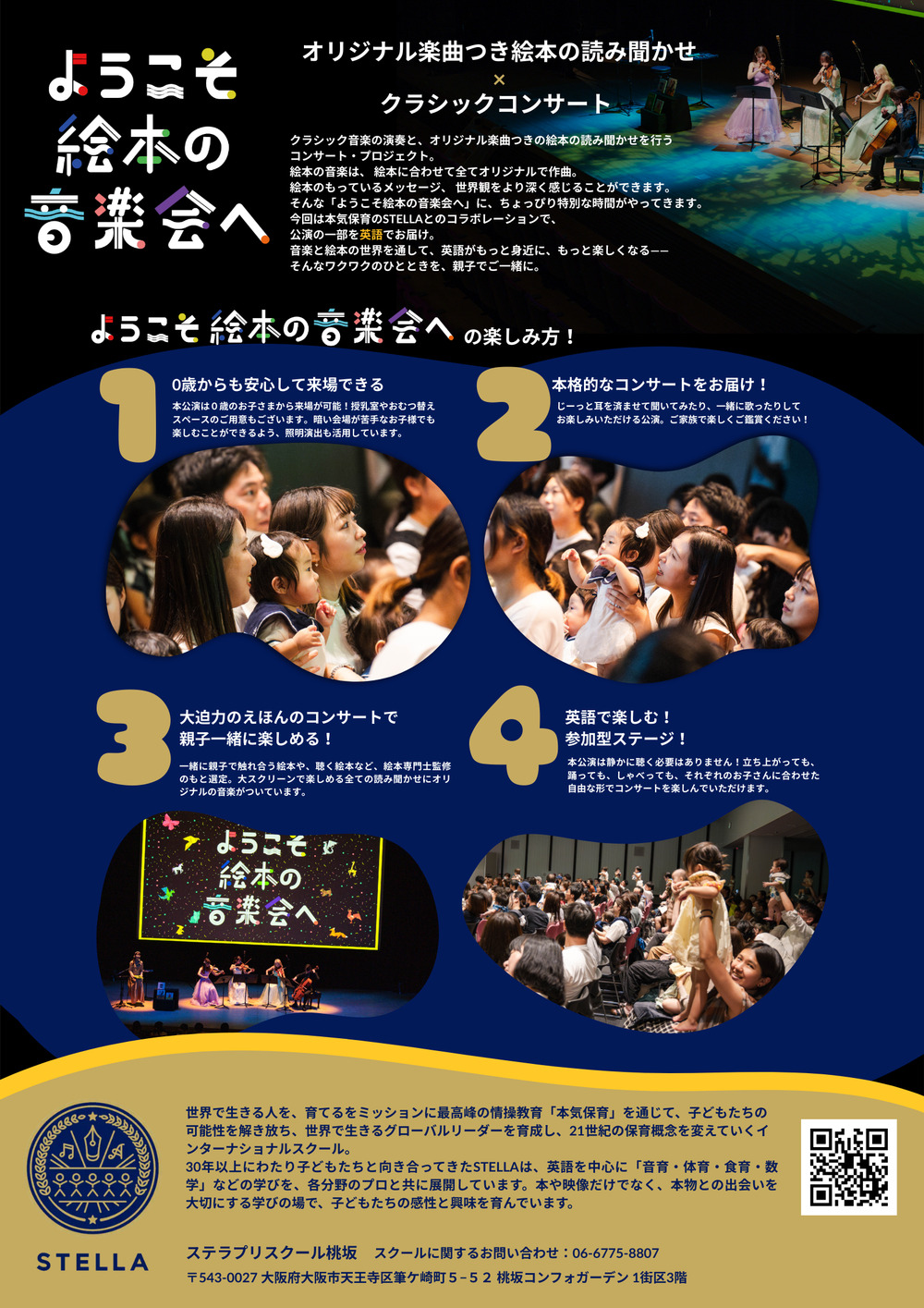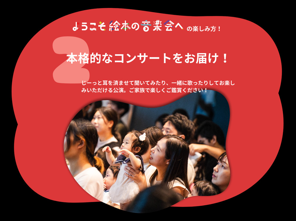 クラシック音楽の演奏と、オリジナル楽曲つきの絵本の読み聞かせを行う コンサート・プロジェクト。 「ようこそ絵本の音楽会へ」