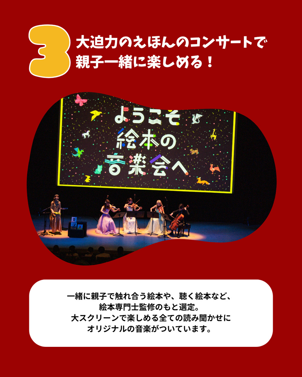 絵本に関する高度な知識、技能及び感性を備えた絵本の専門家である絵本専門士が選定した絵本を本公演では読み聞かせしています。また、読み聞かせする絵本は全て、作曲家がオリジナルで楽曲を制作したものとなります。