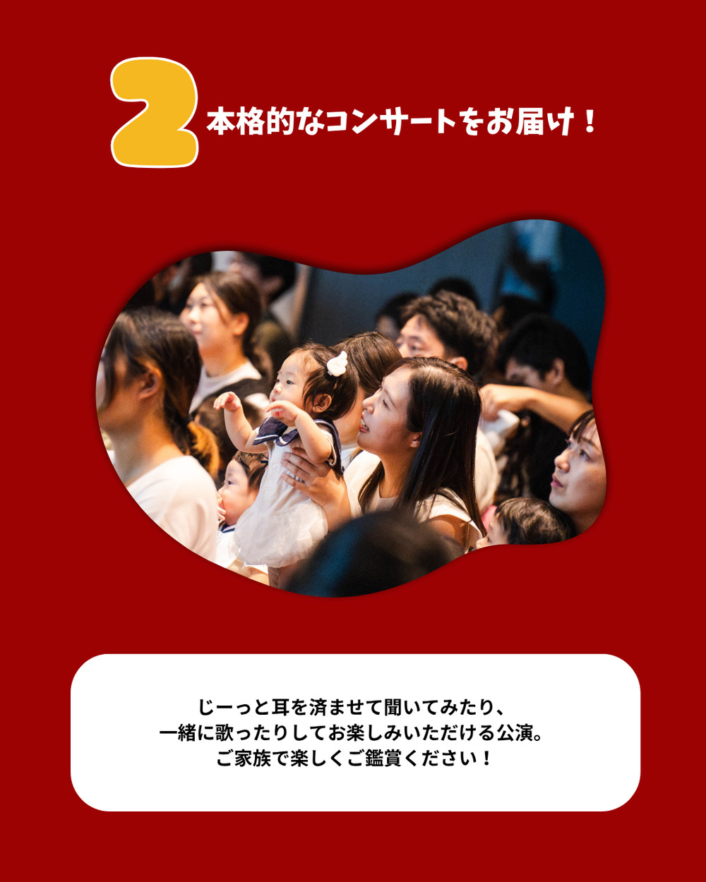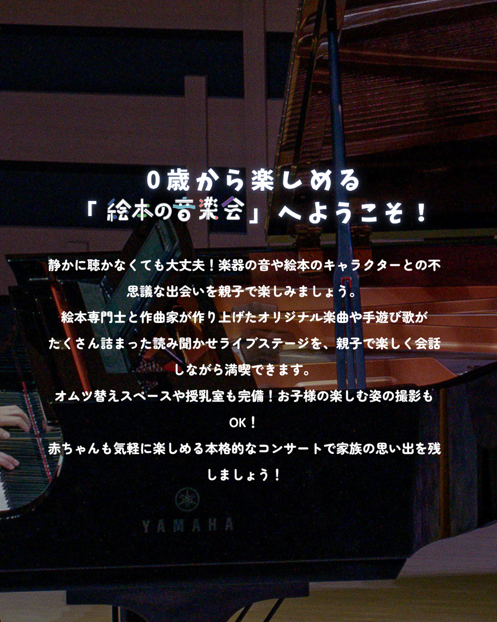 親子でたくさん会話をしながら聴いてほしいと思って制作しているコンサートです。楽器を弾いている手、奏でられている音。絵本に登場するキャラクターたち。たくさんの不思議と発見をご家族でお楽しみください。