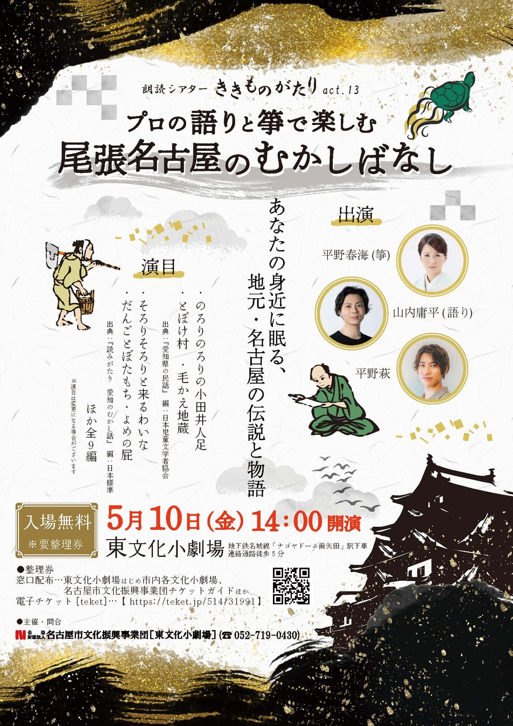 名古屋城に関するお話から、東文化小劇場がある東区にまつわる昔話まで、9編を朗読予定。